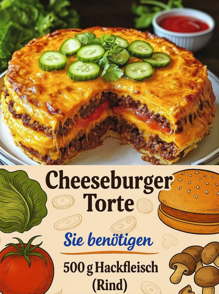 Eine Cheeseburger-Torte klingt im ersten Moment ungewöhnlich – doch genau darin liegt ihr besonderer Reiz. Sie vereint alles, was man an einem klassischen Cheeseburger liebt, in einer originellen, geschichteten Form. Zwischen weichen Tortillas verbergen sich würziges Hackfleisch, eine cremige Käsemischung und aromatische Gewürze, die zusammen ein herzhaftes Geschmackserlebnis schaffen. Obenauf sorgt geschmolzener Cheddar für den unverwechselbaren Cheeseburger-Charakter, während frischer Salat, Tomaten und Gurken die nötige Frische beisteuern.
