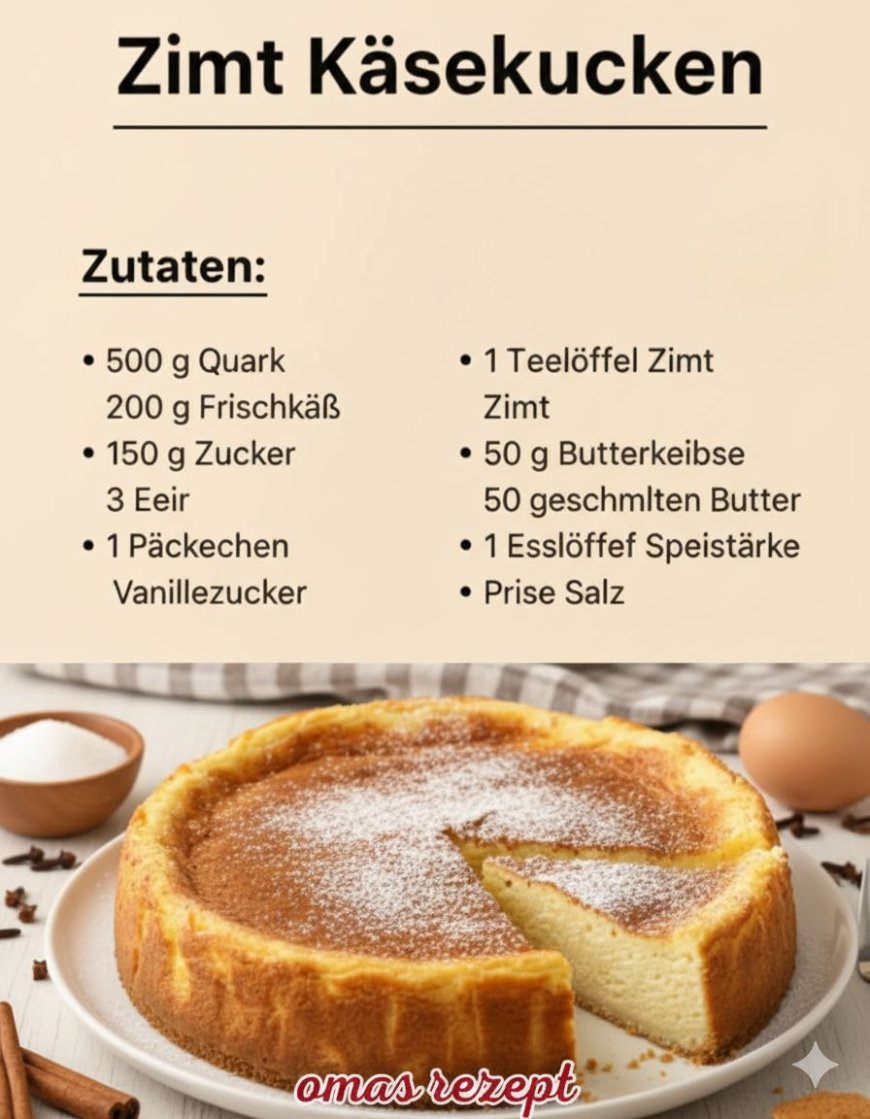 Wenn sich der Duft von Zimt und frisch gebackenem Käsekuchen in der Küche verbreitet, entsteht sofort dieses Gefühl von Wärme, Gemütlichkeit und Zuhause. Dieser Zimt-Käsekuchen vereint alles, was man an der deutschen Backtradition liebt – eine zarte, cremige Quarkfüllung, einen buttrigen Boden und das feine Aroma von Zimt, das an goldene Herbsttage erinnert. Ein einfaches, aber elegantes Dessert, das sich perfekt für gemütliche Nachmittage, festliche Anlässe oder den süßen Abschluss eines Sonntagsessens eignet. Jeder Bissen schmeckt nach Tradition, Wohlbefinden und einem kleinen Stück Heimat.