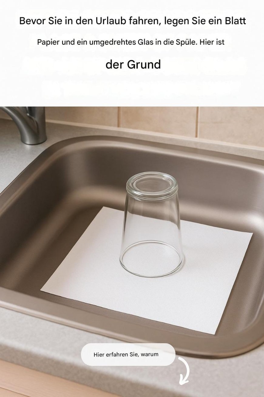 Wenn wir an Urlaubsplanung denken, kümmern wir uns in der Regel um Dinge wie Hotelbuchung, Kofferpacken, Ausweiskontrolle, Navi-Programmierung oder die Bewässerung der Pflanzen während unserer Abwesenheit. Doch es gibt eine unscheinbare, fast unsichtbare Geste, die eine sehr unangenehme Überraschung nach der Rückkehr verhindern kann: Ein umgedrehtes Glas, das auf einem Stück Papier in der Küchenspüle liegt.
