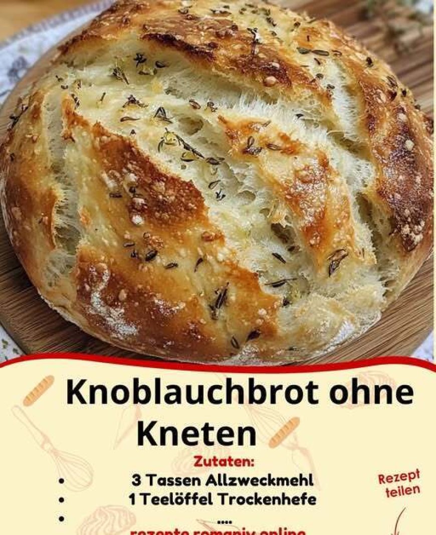 Brot backen kann so einfach und doch so köstlich sein! Wenn du gerne frisches, duftendes Brot genießen möchtest, aber keine Lust auf lange Zubereitungszeiten oder aufwendiges Kneten hast, dann ist dieses Knoblauchbrot genau das Richtige für dich. Mit nur wenigen Zutaten – Mehl, Hefe, Wasser, Knoblauch, Olivenöl und Petersilie – zauberst du im Handumdrehen ein Brot, das nicht nur unglaublich lecker, sondern auch super saftig ist. Der Teig braucht keine lange Bearbeitung, sondern kann einfach über Nacht ruhen, um seine perfekte Textur zu entwickeln. Das Besondere an diesem Rezept ist das Backen im gusseisernen Topf: Es sorgt für eine gleichmäßige Wärmeverteilung und eine wunderschön knusprige Kruste, während das Innere des Brotes zart und fluffig bleibt. Der Duft von frischem Knoblauch und Kräutern, der sich während des Backens im ganzen Haus verteilt, wird sicherlich alle begeistern. Dieses Brot ist nicht nur ein Genuss für den Gaumen, sondern auch für die Sinne – und es passt perfekt zu jedem