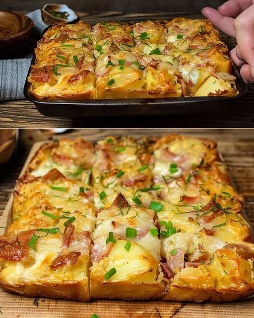 Eine Auflaufform (ca. 30 × 20 cm) einfetten. Eine Schicht Kartoffeln hineingeben, darauf etwas Schinken-Zwiebel-Mischung und geriebenen Käse streuen. Diesen Vorgang wiederholen, bis alle Zutaten aufgebraucht sind.