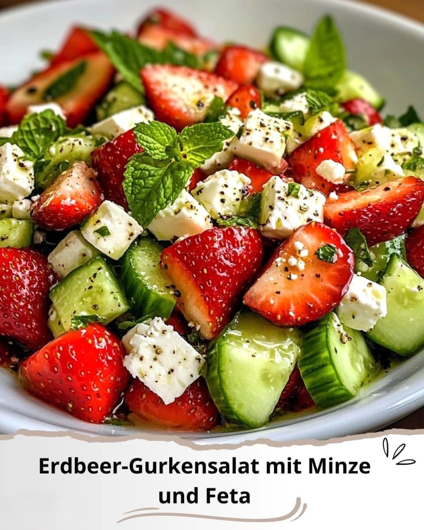 Wenn süß auf salzig trifft, entsteht etwas ganz Besonderes – genau wie bei diesem erfrischenden Gurkensalat mit Erdbeeren, Minze und Feta. Was zunächst ungewöhnlich klingt, entpuppt sich als wahre Geschmacksexplosion: Die fruchtige Süße der Erdbeeren harmoniert perfekt mit der herzhaften Note des Feta-Käses, während frische Minze und ein feines Zitronen-Dressing dem Salat eine sommerliche Leichtigkeit verleihen.