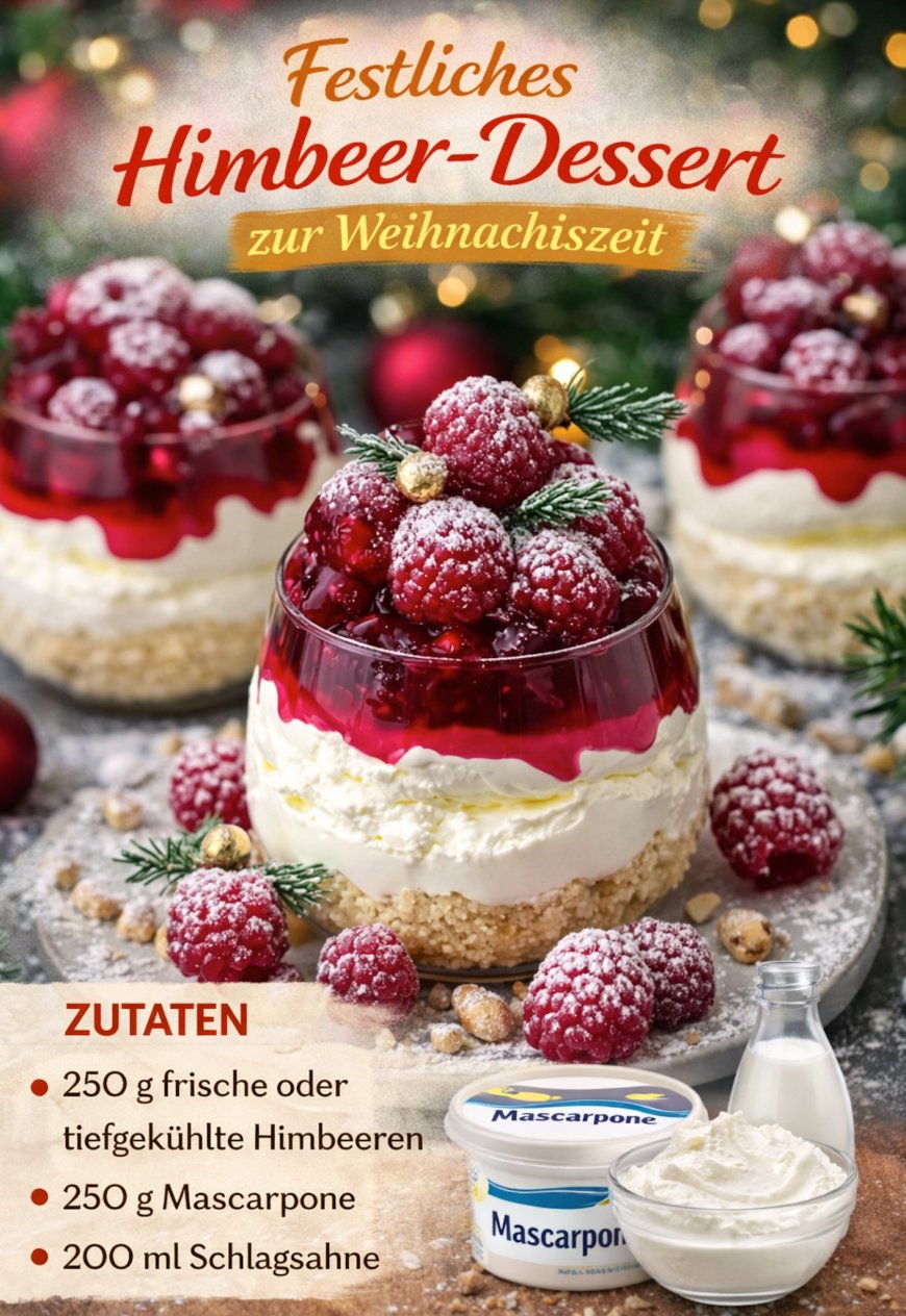 Dieses elegante Himbeer-Dessert im Glas ist ein echter Blickfang auf jeder festlichen Tafel und überzeugt gleichzeitig durch seinen harmonischen Geschmack. Die Kombination aus fruchtig-säuerlichen Himbeeren, einer cremigen Mascarpone-Sahne-Schicht und einem feinen Keksboden sorgt für ein ausgewogenes Dessert, das nicht zu schwer wirkt und dennoch herrlich verwöhnt. Besonders zur Weihnachtszeit passt dieses Dessert ideal, da es sich hervorragend vorbereiten lässt und durch seine Schichtung optisch sehr edel wirkt. Serviert in Gläsern eignet es sich perfekt für Gäste, Feiertage oder das festliche Familienessen.