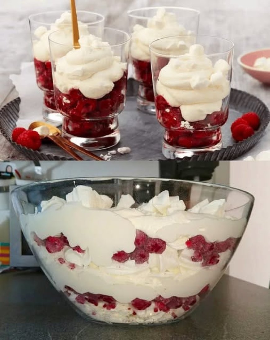 Die Kombination von cremigem Quark und Sahne sorgt für eine samtige Textur, die durch die frischen Himbeeren und die knackigen Baiserstücke ergänzt wird. Mascarpone und weiße Schokolade verleihen dem Dessert eine besondere Tiefe, die es zu einem echten Genussmoment macht. Die