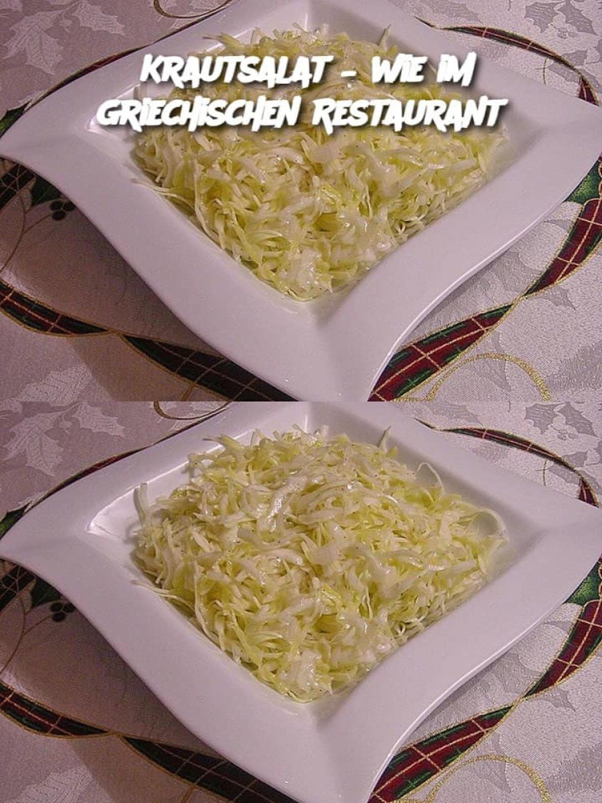 Krautsalat wie im griechischen Restaurant – Einfach und köstlich Dieser Krautsalat bringt den Geschmack Griechenlands direkt auf Ihren Tisch. Fein geraspelter Weißkohl und würzige Zwiebelwürfel werden mit einem Sud aus Zucker, Kräuteressig, Öl, Salz, Pfeffer und spritzigem Mineralwasser mariniert. Nach einer Ruhezeit von 24 Stunden entfaltet der Salat sein volles Aroma. Er ist die perfekte Beilage zu Gegrilltem, leicht zuzubereiten und bleibt im Kühlschrank lange frisch. Ob für Sommerfeste, Grillabende oder als Snack – dieser Krautsalat begeistert mit seiner knackigen Textur und dem ausgewogenen Geschmack. Einfach ausprobieren und genießen!