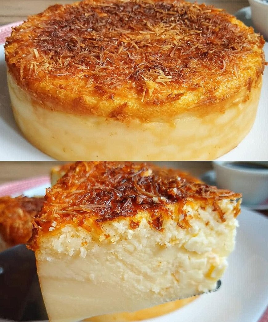 Geben Sie zunächst die Eier, Kokosmilch, Butter, Kondensmilch und Vollmilch in einen Mixer. Mixen Sie alles etwa 4 Minuten lang, bis eine glatte Masse entsteht.
