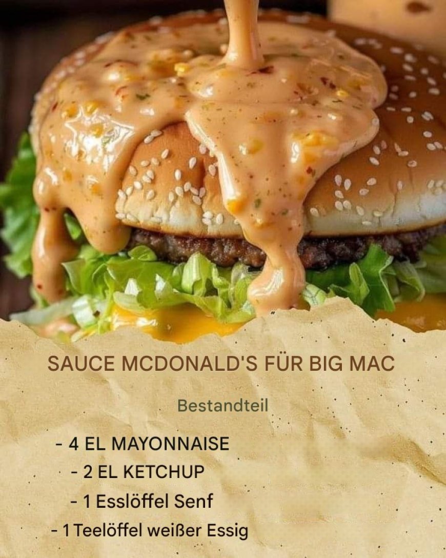 Hausgemachte Big Mac Sauce – Der Klassiker für zu Hause Die legendäre Big Mac Sauce von McDonald’s ist ein unverzichtbarer Bestandteil des berühmten Burgers. Mit diesem einfachen Rezept können Sie die Sauce zu Hause nachmachen und den unverwechselbaren Geschmack selbst erleben. Die Basis bildet eine cremige Mischung aus Mayonnaise, Ketchup und Senf. Gewürzt wird mit Paprika, Zwiebel- und Knoblauchpulver sowie einem Hauch Zucker und Essig für die perfekte Balance aus Süße und Würze. Nach der Zubereitung sollte die Sauce mindestens 30 Minuten im Kühlschrank ruhen, damit sich die Aromen optimal entfalten können. Ideal ist die hausgemachte Big Mac Sauce nicht nur für Burger, sondern auch als Dip für Pommes oder als Highlight in Sandwiches. Das Rezept ist leicht anpassbar: Mögen Sie es süßer, fügen Sie mehr Zucker hinzu, oder für eine würzigere Note mehr Senf und Paprika. In wenigen Schritten holen Sie sich das typische McDonald’s-Geschmackserlebnis in Ihre eigene Küche.