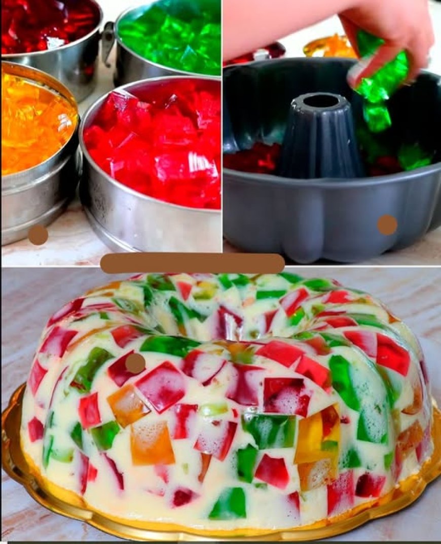 1. In einer großen Form die farbigen Gelatinewürfel mischen.