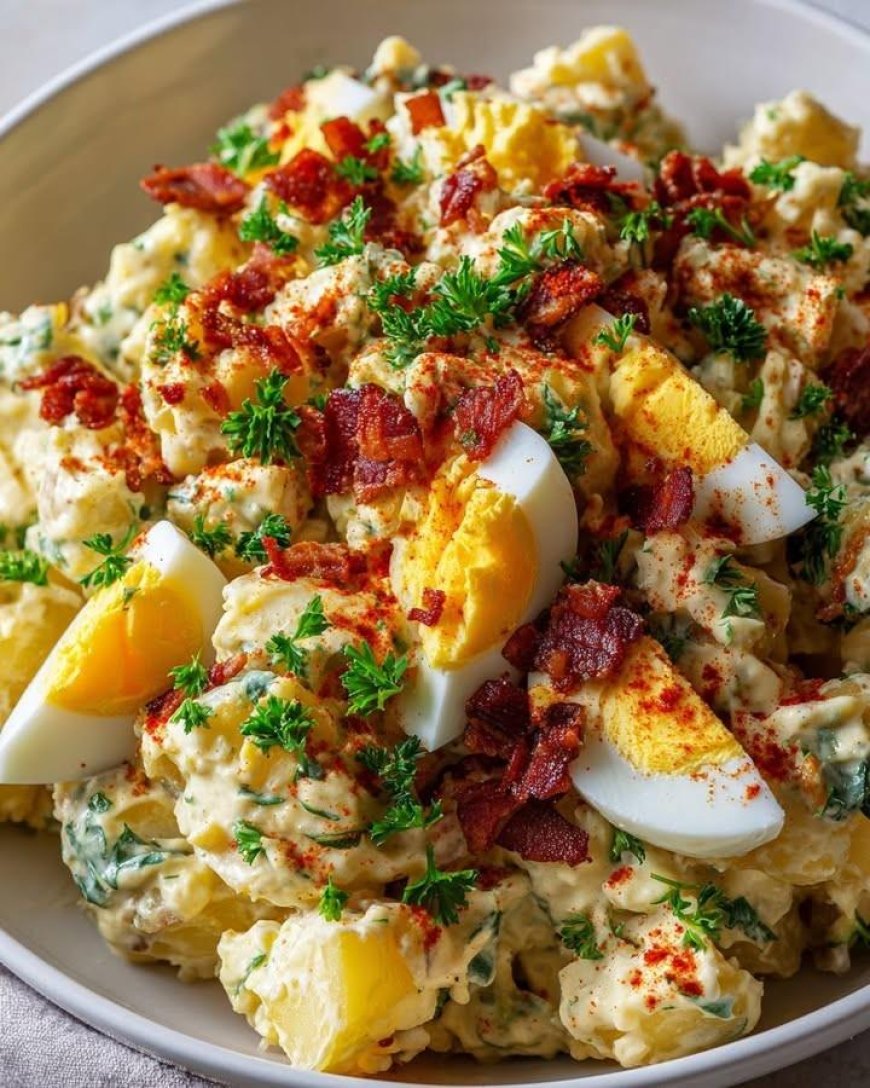 Manche Gerichte sind weit mehr als nur eine Mahlzeit – sie sind Erinnerungen, Traditionen und ein Stück Familiengeschichte. Dieser Südstaaten-Kartoffelsalat mit Speck und Ei gehört genau zu diesen Rezepten. Er erinnert an gemütliche Sonntage, an lange gedeckte Tische und an den unverwechselbaren Duft aus der Küche, wenn Oma noch vor dem Gottesdienst alles mit Ruhe und Liebe vorbereitete. Für viele ist es genau dieser Geschmack, der bis heute untrennbar mit Geborgenheit und familiärem Zusammensein verbunden ist.