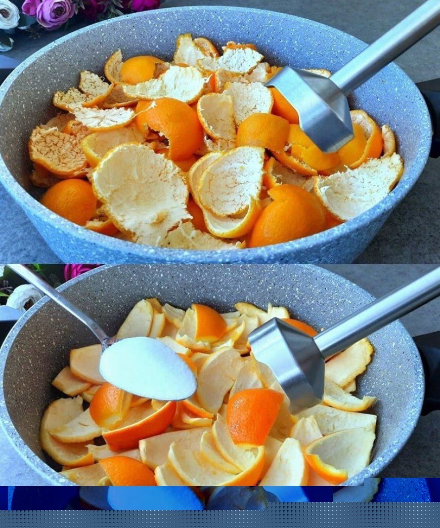 Um dieses Rezept erfolgreich zu machen, müssen Sie einen Topf nehmen und etwa einen Liter Wasser und die Orangenschalen hineingießen. Dann einfach die Esslöffel Salz und den Esslöffel Natron hinzufügen und dann gut vermischen.