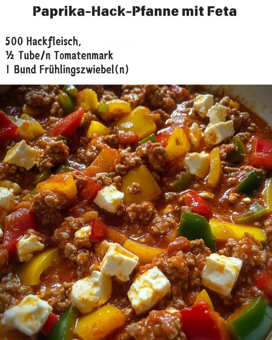 Paprika Hack Pfanne mit Feta ist ein einfaches und zugleich leckeres Gericht, das sich perfekt für ein schnelles Mittag- oder Abendessen eignet. Es kombiniert zartes Rinderhackfleisch mit der frischen Süße von Paprika und Frühlingszwiebeln, abgerundet durch die cremige Textur von Sahne und Sahneschmelzkäse. Das Tomatenmark fügt eine tiefgründige, würzige Note hinzu, die zusammen mit der Brühe eine aromatische Grundlage bildet. Die Zugabe von Feta sorgt für eine salzige Frische und verleiht dem Gericht eine angenehme Cremigkeit, die das Hackfleisch perfekt ergänzt.