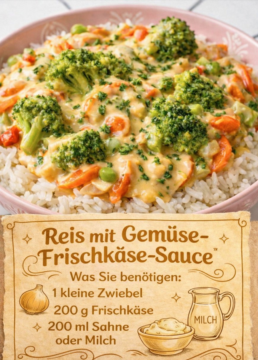 Ob als einfaches Mittagessen, schnelles Abendessen oder als unkompliziertes Familiengericht – dieser cremige Reis mit Gemüse und Frischkäse-Sauce ist ein echtes Wohlfühlrezept, das ohne großen Aufwand zuverlässig gelingt und immer wieder gerne auf den Tisch kommt.