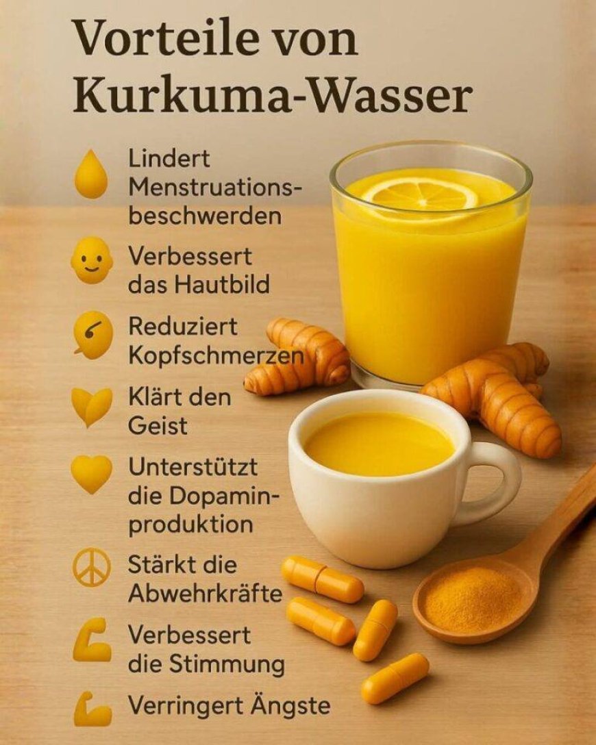 Kurkuma-Wasser ist ein einfach zuzubereitendes, aber äußerst wirkungsvolles Getränk, das in vielen Kulturen seit Jahrhunderten geschätzt wird. Die leuchtend gelbe Wurzel Kurkuma ist vor allem für ihren Wirkstoff Curcumin bekannt, der stark entzündungshemmende und antioxidative Eigenschaften besitzt. In Kombination mit warmem Wasser, etwas Zitrone und einer kleinen Prise schwarzem Pfeffer entsteht ein Getränk, das den Körper von innen unterstützt und sich hervorragend in den täglichen Gesundheitsrhythmus integrieren lässt.