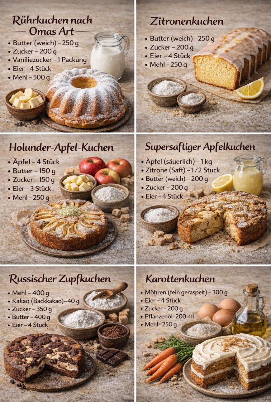 Ob ein einfacher Rührkuchen, ein frischer Zitronenkuchen, ein fruchtiger Apfelkuchen oder der beliebte russische Zupfkuchen – all diese Klassiker haben eines gemeinsam: Sie gelingen immer und kommen bei Jung und Alt gleichermaßen gut an. Es sind Rezepte, die sich bewährt haben, die man gerne weitergibt und immer wieder backt. Jeder Kuchen hat seinen eigenen Charakter, von herrlich saftig über angenehm frisch bis hin zu cremig und schokoladig.