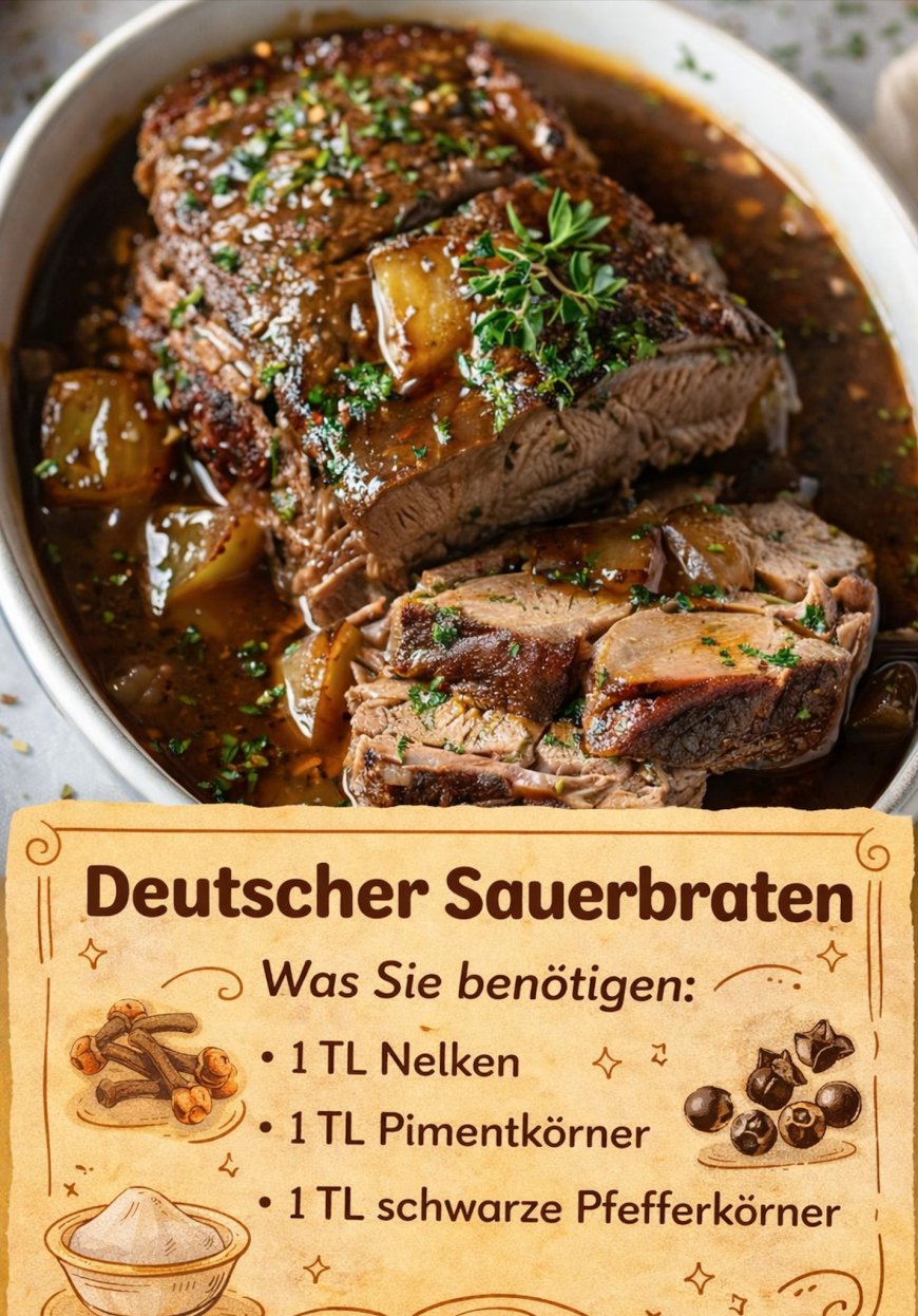 Dieser Sauerbraten ist ein echtes Traditionsgericht der deutschen Küche und steht für Geduld, Sorgfalt und tiefes Aroma. Das Geheimnis seines unverwechselbaren Geschmacks liegt in der lange gezogenen Marinade, in der das Rindfleisch mehrere Tage ruht und dabei nicht nur zarter wird, sondern auch die feinen Gewürznoten von Essig, Lorbeer, Nelken und Piment aufnimmt. Durch das anschließende langsame Schmoren entsteht ein butterzarter Braten, der sich mühelos schneiden lässt und von einer kräftigen, leicht süß-säuerlichen Soße begleitet wird.