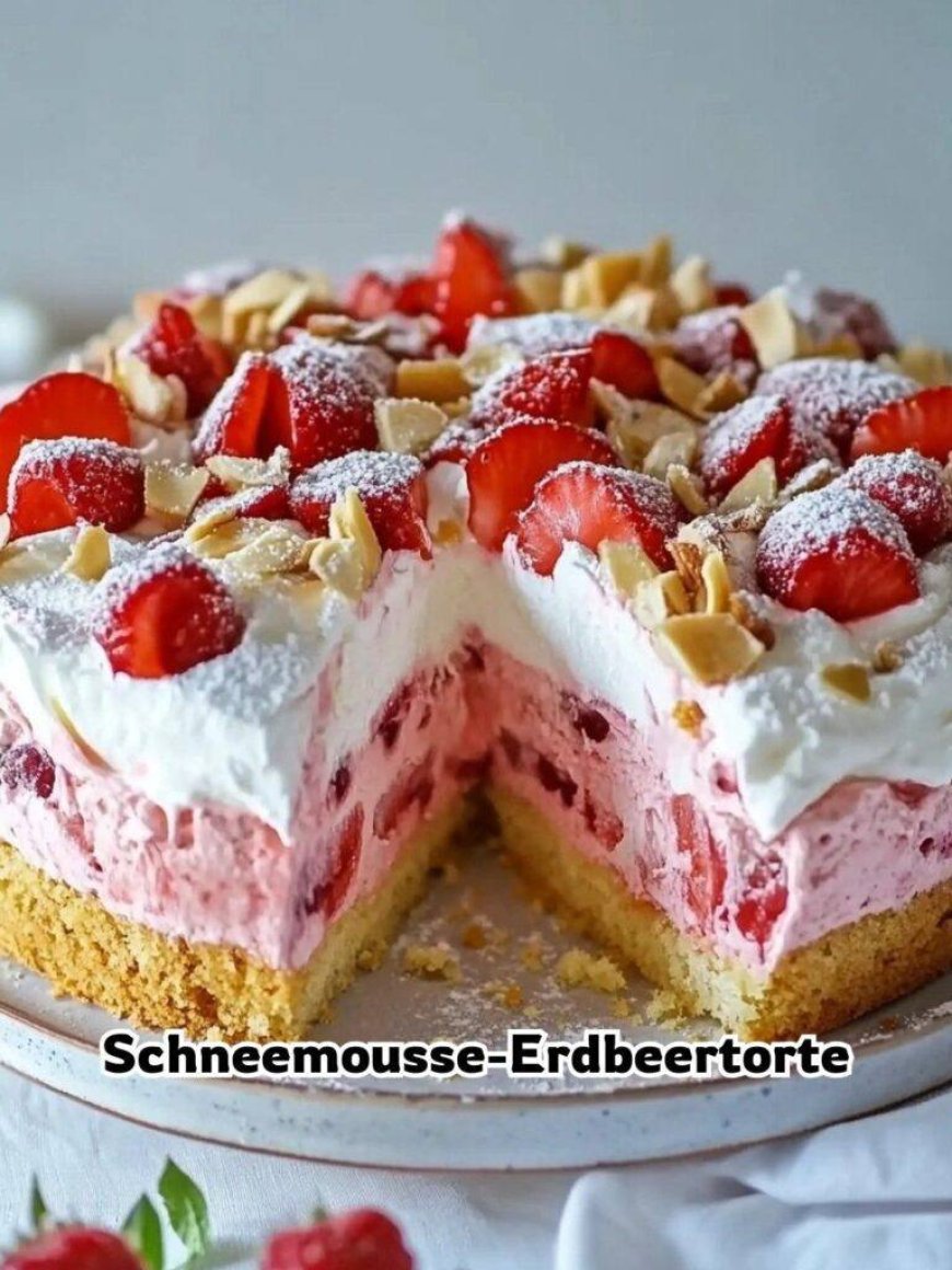 Gerade diese Torte eignet sich ideal für besondere Anlässe, bei denen etwas „Feineres“ auf den Tisch kommen soll, ohne überladen oder kompliziert zu sein. Ob Geburtstag, Familienfeier, Sommerfest oder Kaffeetafel am Wochenende – sie wirkt festlich, bleibt aber angenehm frisch und harmonisch. Die Erdbeeren bringen natürliche Süße und Fruchtigkeit, während die Schneemousse mit ihrer sanften Vanillenote für Eleganz