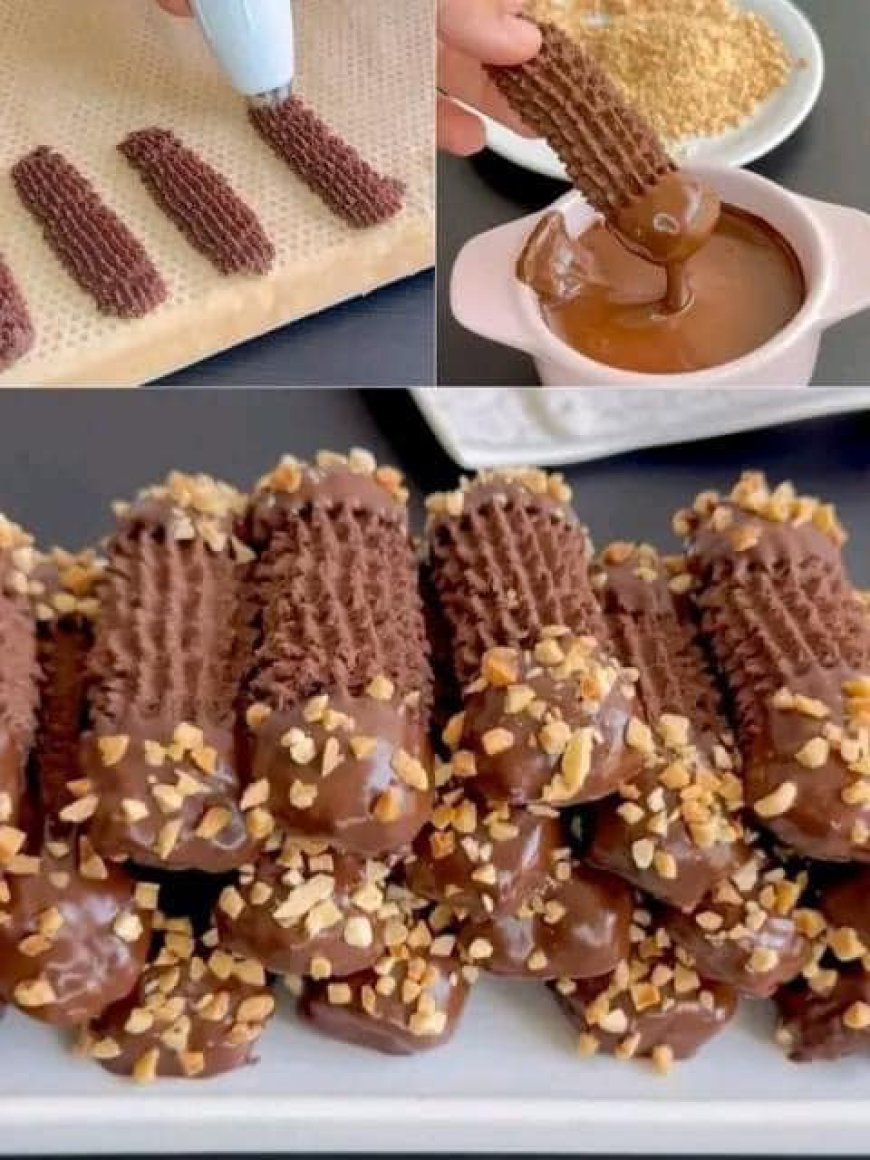 Ein knuspriges, zartes Schokoladengebäck, das mit einer Spritztülle geformt wird, anschließend in geschmolzene Schokolade getaucht und mit gehackten Nüssen veredelt wird. Dieses Gebäck ist ideal für Kaffee, Feiertage oder als hübsches Geschenk aus der Küche. Außen knusprig, innen zart – und dank der Schokospitze ein echter Hingucker.
