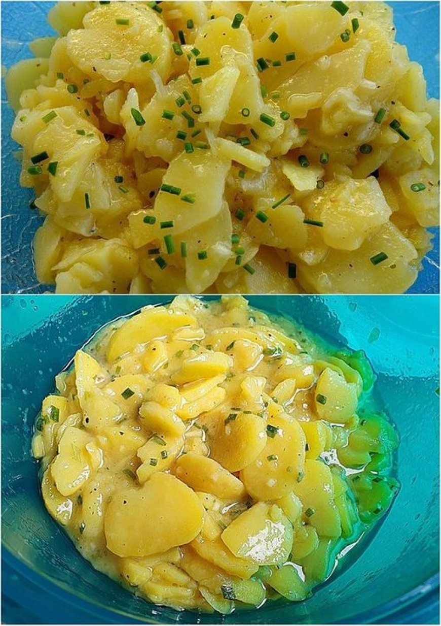 Der Kartoffelsalat gewinnt an Geschmack, wenn er nach der Zubereitung noch etwas Zeit hat, um zu ziehen. Wenn möglich, lassen Sie ihn eine Stunde lang stehen, bevor Sie ihn T.ippe-n Sie auf das Foto, um das volls-tändige Rezept anzu-zeigen