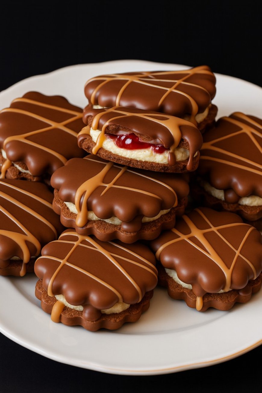 Diese edlen Sandwich-Kekse sind eine perfekte Kombination aus knusprigem Mürbteig, cremiger Vanillefüllung und einem fruchtigen Kern aus Kirsch- oder Himbeerkonfitüre. Überzogen mit einer glänzenden Vollmilchschicht und feinen Karamelllinien erinnern sie an luxuriöse Confiserie-Pralinen. Die Kekse sind ideal für festliche Anlässe, Geschenkdosen oder als dekoratives Highlight auf einer Kaffeetafel. Trotz ihres eleganten Aussehens lassen sie sich mit etwas Geduld wunderbar zu Hause herstellen – und das Ergebnis ist sowohl geschmacklich als auch optisch ein absoluter Genuss.