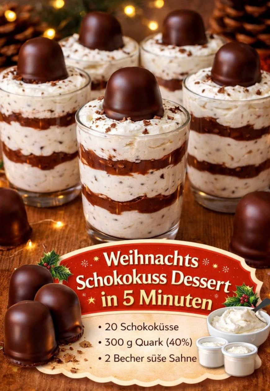 Dieses elegante Dessert ist der perfekte Beweis dafür, dass man für einen beeindruckenden Nachtisch weder Backofen noch lange Vorbereitungszeit braucht. Das Weihnachts-Schokokuss-Dessert im Glas überzeugt durch seine wunderbar luftige Creme, feine Schokoladenschichten und eine festliche Optik, die sofort Weihnachtsstimmung auf den Tisch bringt. Ideal für Feiertage, spontane Gäste oder als süßer Abschluss eines festlichen Menüs.