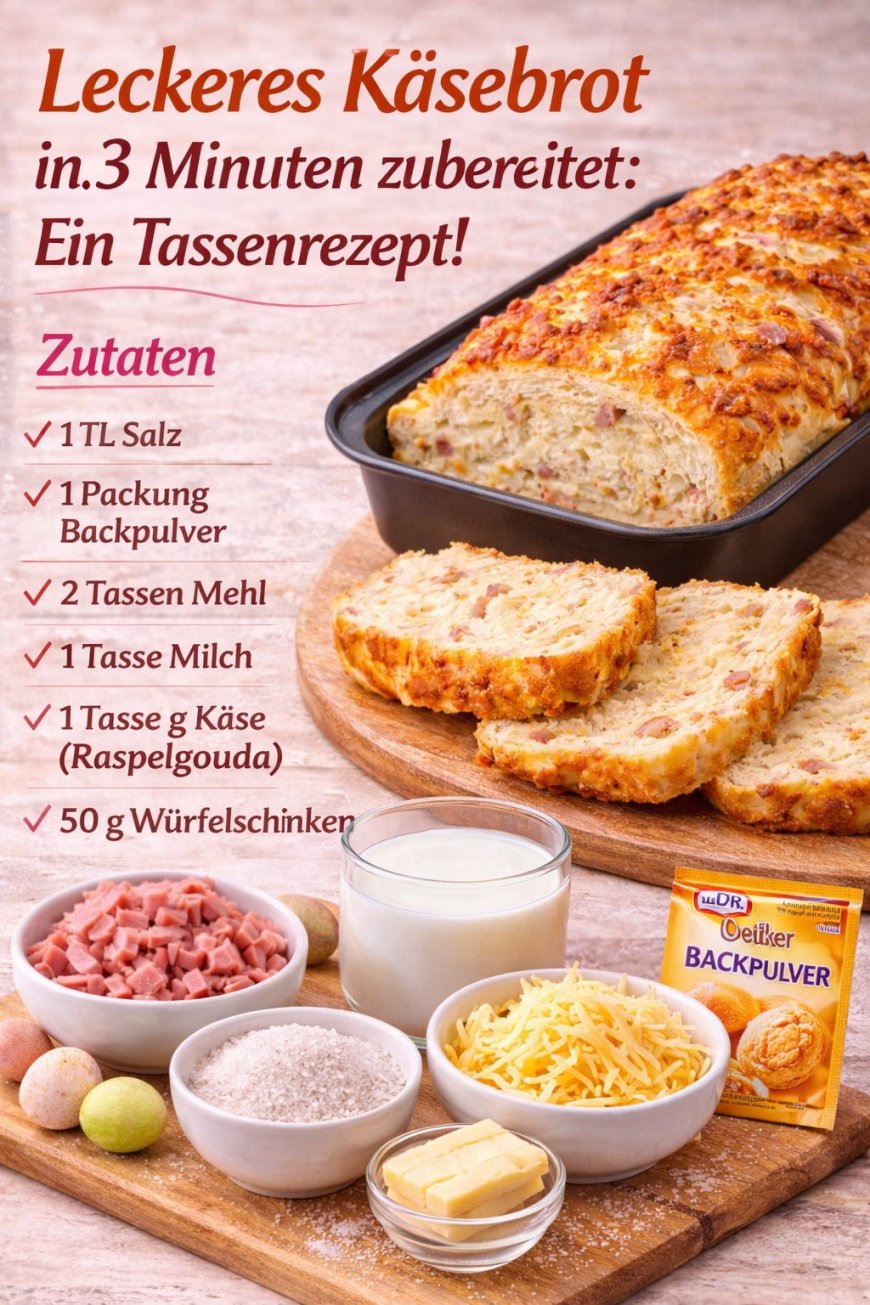 Wenn es schnell gehen soll, aber trotzdem etwas Herzhaftes und Selbstgemachtes auf dem Tisch stehen soll, ist dieses Käsebrot genau die richtige Wahl. Dieses Rezept ist besonders beliebt, weil es ohne Hefe auskommt und in wenigen Minuten vorbereitet werden kann. Dank der einfachen Tassen-Methode brauchst du keine Küchenwaage – eine Tasse reicht aus, um alle Zutaten abzumessen.