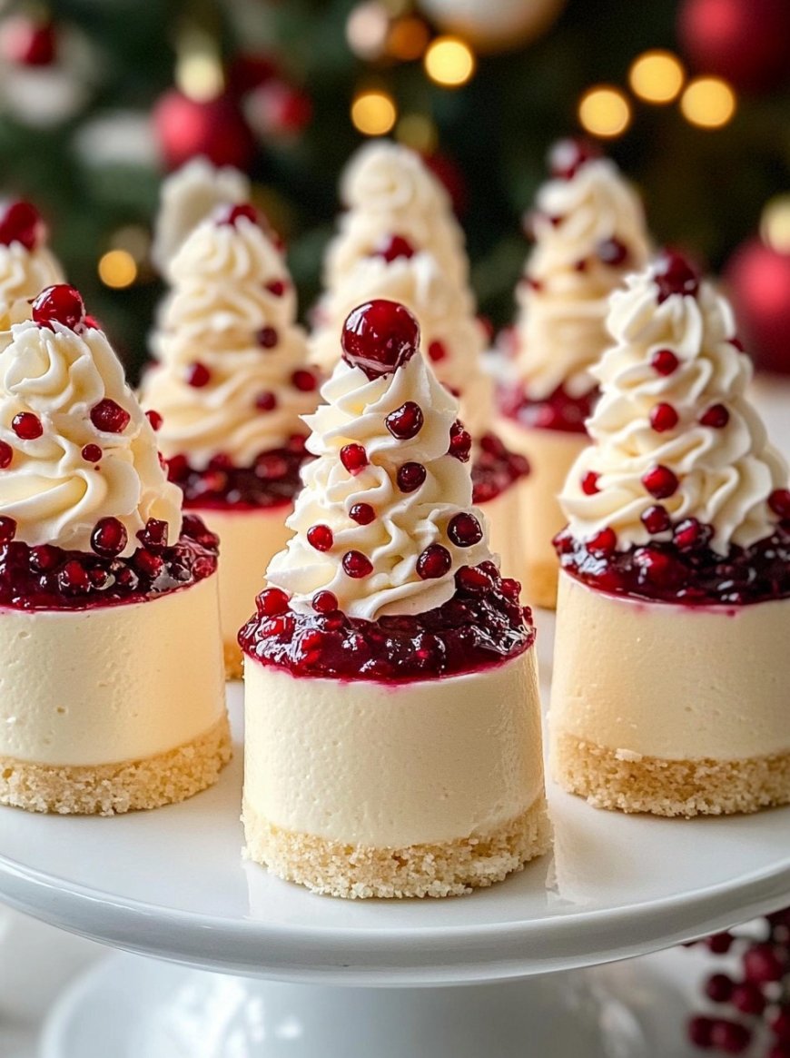 Diese Tannenbaum-Mini-Cheesecakes sind ein echter Blickfang auf jeder winterlichen Kaffeetafel und verbinden festliche Optik mit cremigem Genuss. Sie vereinen einen zarten Keksboden, eine samtige Cheesecake-Füllung und fruchtiges Beerenkompott zu einem harmonischen Dessert, das nicht nur geschmacklich, sondern auch optisch begeistert. Die kleinen grünen Buttercreme-Tannenbäume machen aus jedem einzelnen Cheesecake ein liebevoll gestaltetes Weihnachtsdessert.