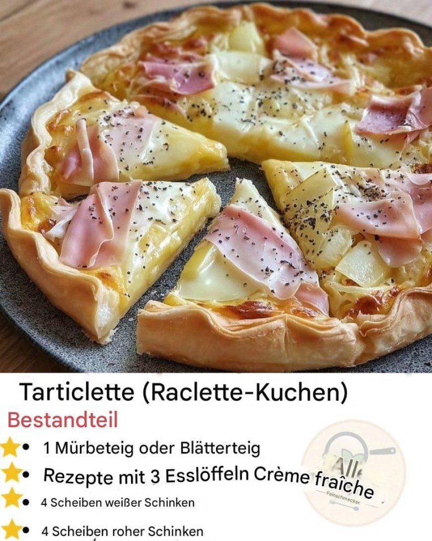 Zarte, vorgekochte Kartoffelwürfel verleihen der Tarte eine angenehme Fülle, während die Mischung aus weißem und rohem Schinken für unterschiedliche Geschmacksnuancen sorgt: mild, leicht salzig und aromatisch. Der Raclettekäse schmilzt gleichmäßig und bildet eine saftige, dehnbare Käsekruste, die die Tarte optisch wie geschmacklich vollendet.