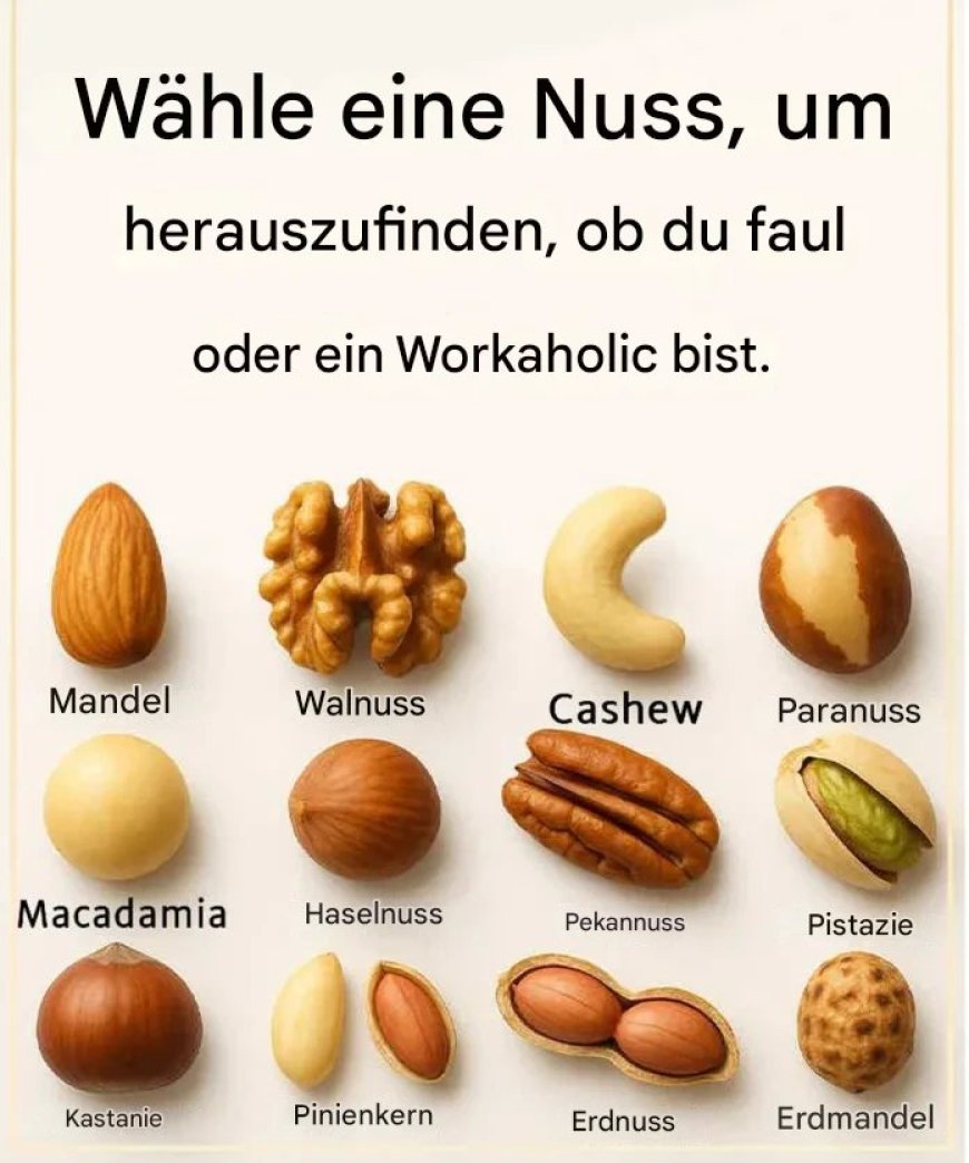 Manchmal verraten die kleinsten Entscheidungen mehr über uns, als wir denken. Was wir gerne essen, scheint auf den ersten Blick nur eine Frage des Geschmacks zu sein – doch tatsächlich kann unsere Vorliebe für bestimmte Snacks auch etwas über unsere Persönlichkeit, unsere Gewohnheiten und sogar unsere Einstellung zur Arbeit aussagen. Dieser einfache und unterhaltsame Test lädt dich dazu ein, deine Lieblingsnuss auszuwählen und einen Blick hinter die Oberfläche zu werfen. Bist du jemand, der ständig beschäftigt ist, immer mehr erreichen will? Oder gehörst du zu denen, die das Leben bewusst ruhiger angehen und Balance schätzen? Vielleicht erkennst du dich in den folgenden Beschreibungen wieder – und entdeckst dabei eine Seite an dir, die dir bisher gar nicht bewusst war.