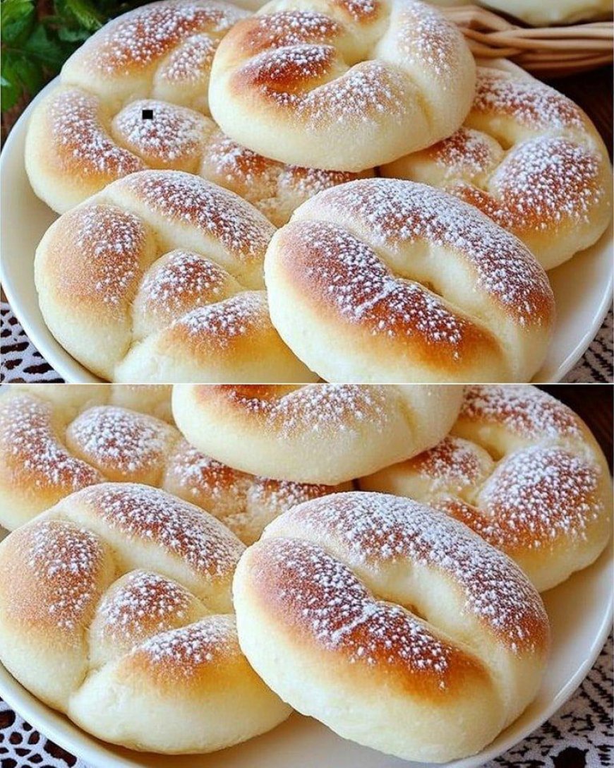 Diese Brötchen bestechen allein durch ihr Aussehen: außen gleichmäßig goldbraun gebacken, innen sichtbar weich und luftig, oben leicht mit Puderzucker bestäubt. Die gedrehte, ringartige Form erinnert an kleine Hefeknoten oder zarte Hefekränze. Es handelt sich eindeutig um ein süßes Hefegebäck ohne sichtbare Füllung, dessen Fokus ganz auf der flauschigen Textur und dem milden, leicht süßen Geschmack liegt.