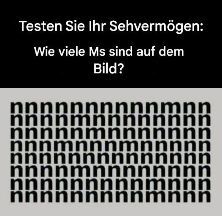 Visuelle Rätsel wie der Sehtest, bei dem man versteckte „m“ in einem Raster finden muss, sind eine unterhaltsame Möglichkeit, die eigene Aufmerksamkeit und Geduld zu testen. Wer alle „m“ schnell findet, zeigt eine ausgezeichnete Fähigkeit, Details zu erkennen. Wenn es schwieriger war, erinnert uns der Test daran, wie wichtig es ist, bewusst hinzusehen und achtsam zu sein. Solche Herausforderungen fördern nicht nur die Konzentration, sondern auch die geistige Fitness. Teilen Sie den Test mit Freunden und Familie und sehen Sie, wer die „m‘s“ am schnellsten entdeckt!